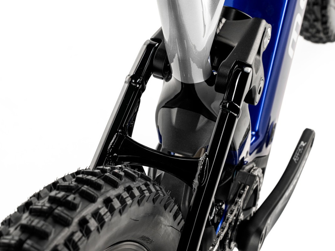 tapered head tube, one-piece Monoblock upper link, HHG internal cable routing, MAX capacity sealed bearings, oversize 15mm axles, exclusive plastic motor covers.